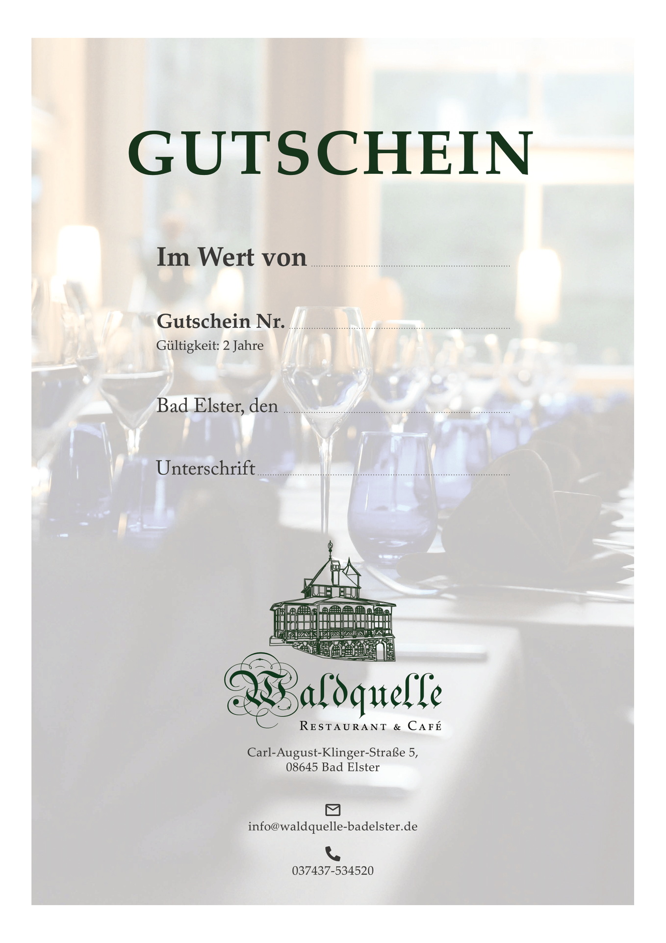 Liebe Gäste der Waldquelle, hier finden Sie Unsere Anschrift und die Öffnungszeiten. e-mail: info@waldquelle-badelster.de. Telefonisch erreichen Sie uns innerhalb unserer Öffnungszeiten unter der Telefonnummer: 037437-534520 Wir freuen uns auf Sie. Öffnungszeiten: Täglich ab 11.00 Uhr So - Do Küchenschluß 18.30 Uhr Fr + Sa Küchenschluß 19.30 Uhr Montag Ruhetag außer an Feiertagen oder nach Vereinbarung Anschrift: BEB Waldquelle OHG Carl-August-Klingner-Straße 5 08645 Bad Elster